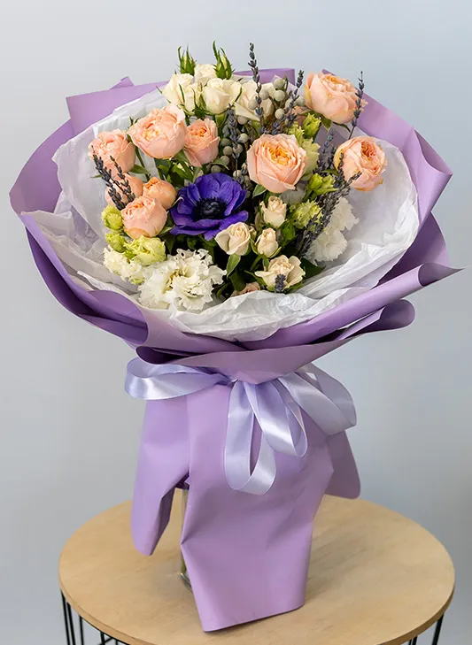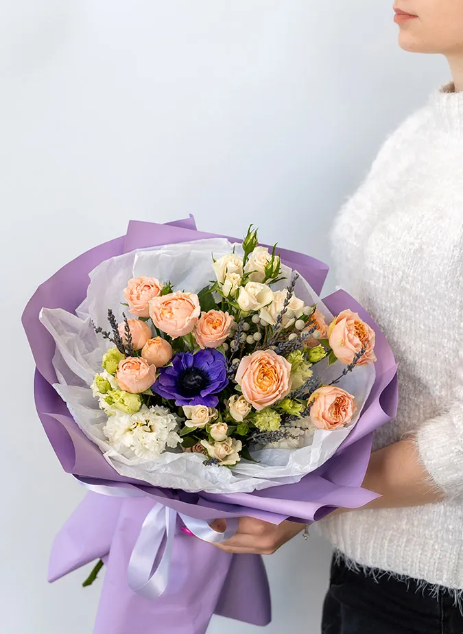 Состав: анемон, лаванда, роза кустовая, бруния, эустома