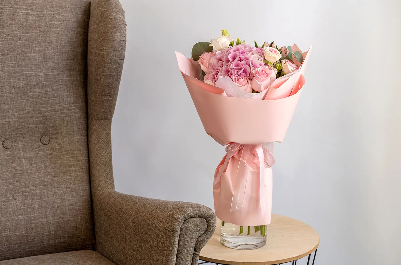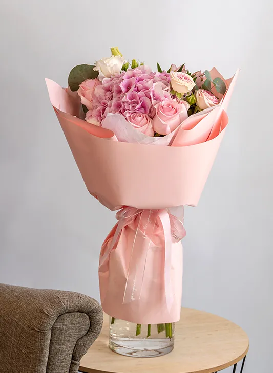 Состав: гортензия, роза кустовая, альстромерия, роза, эустома