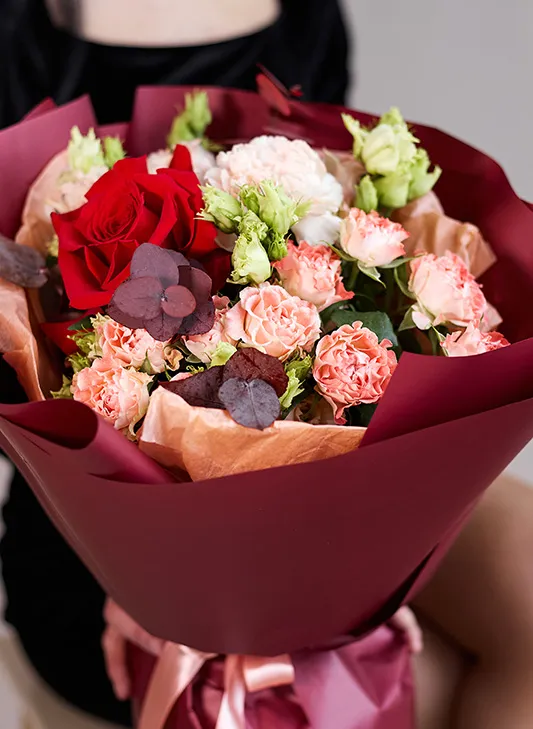 Состав: роза, эустома, гвоздика, роза кустовая, эвкалипт