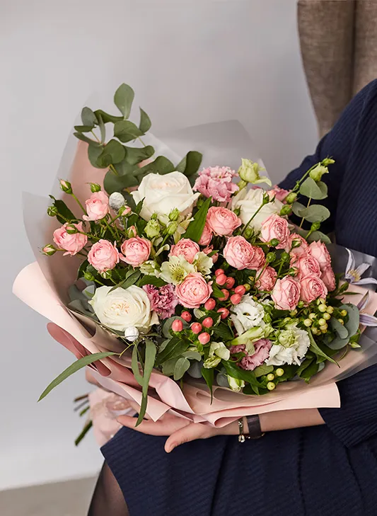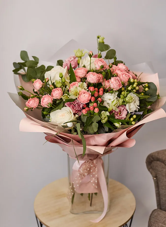 Состав: роза, эустома, альстромерия, роза кустовая, гиперикум, эвкалипт