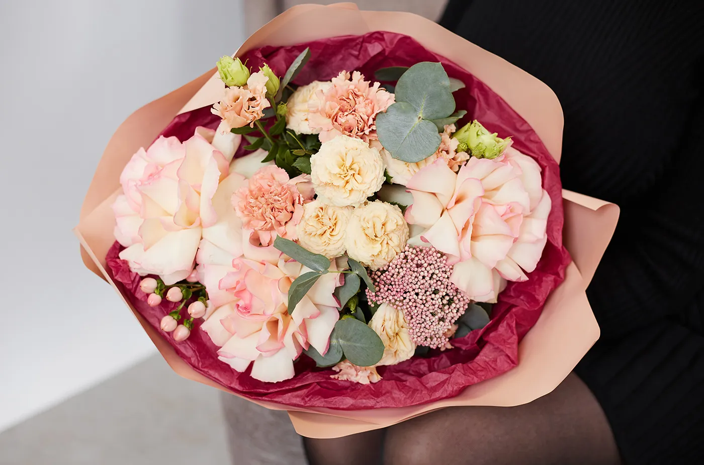Состав: роза кустовая, гвоздика, гиперикум, озотамнус, эустома, эвкалипт, писташ
