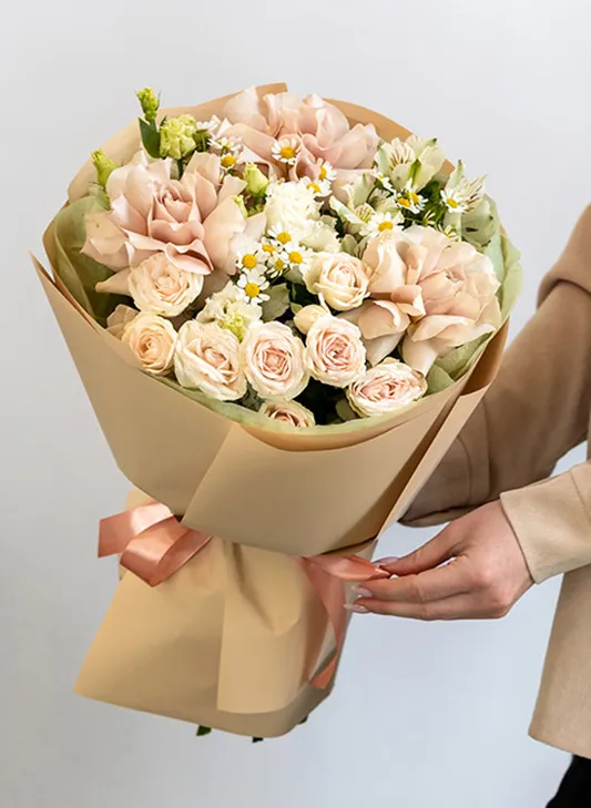 Живые цветы всегда уникальны, поэтому букет может немного отличаться от фото. При отсутствии какого-то сорта мы предложим его замену на другой, близкий по оттенку и равный по стоимости.