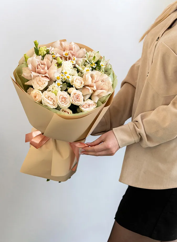 Состав: матрикария, роза одиночная, эустома, альстромерия, роза кустовая