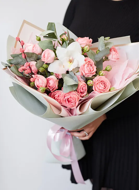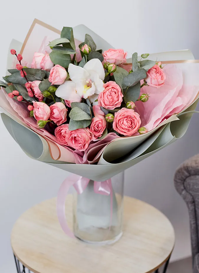 Состав: Орхидея, роза кустовая, салал, эвкалипт
