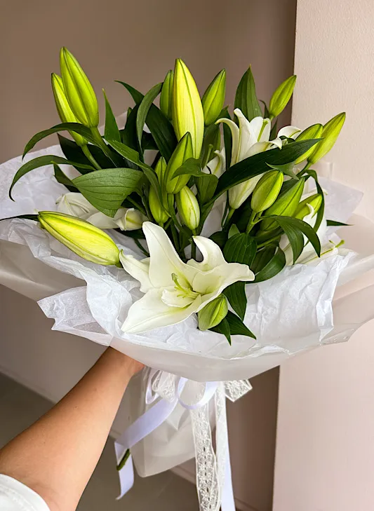 Живые цветы всегда уникальны, поэтому букет может немного отличаться от фото. При отсутствии какого-то сорта мы предложим его замену на другой, близкий по оттенку и равный по стоимости.