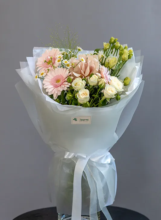 Живые цветы всегда уникальны, поэтому букет может немного отличаться от фото. При отсутствии какого-то сорта мы предложим его замену на другой, близкий по оттенку и равный по стоимости.