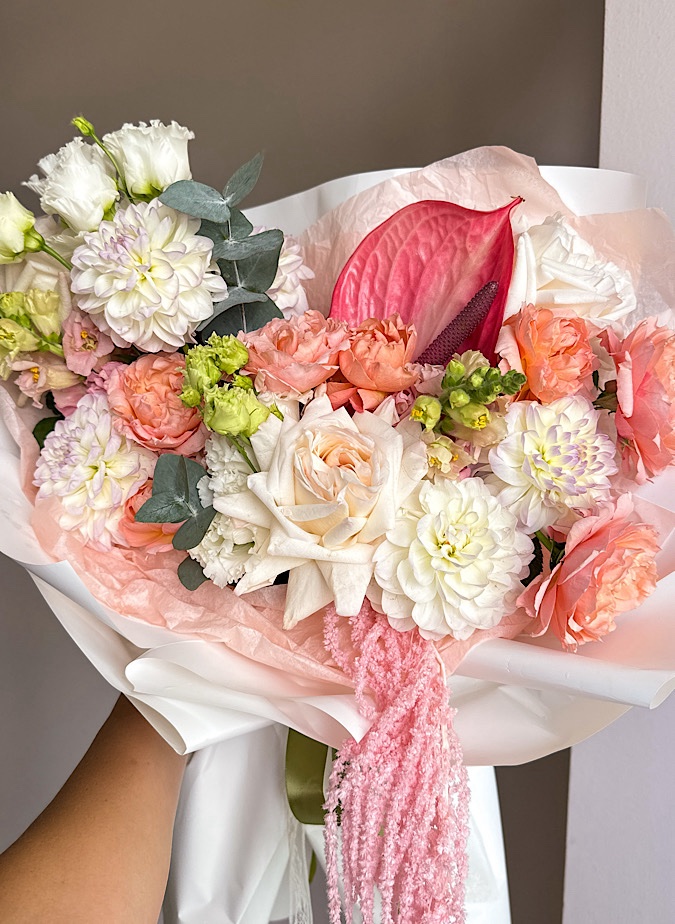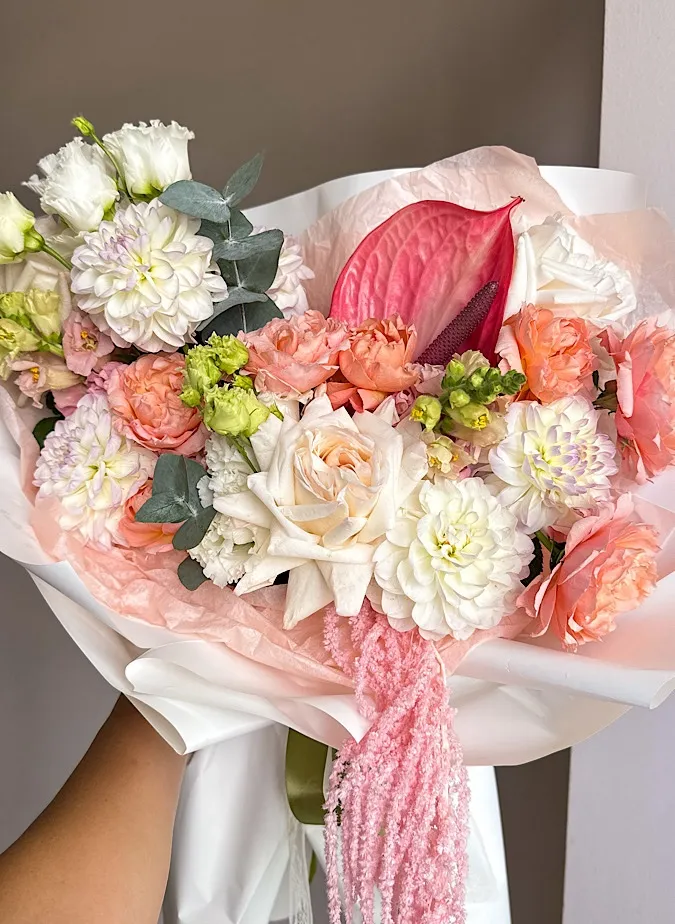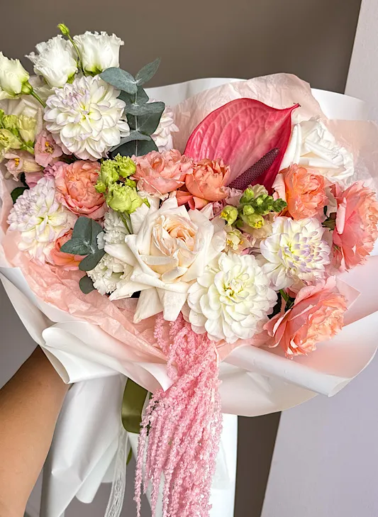 Состав: георгин, антуриум, роза кустовая, эустома, амарант, роза, эвкалипт