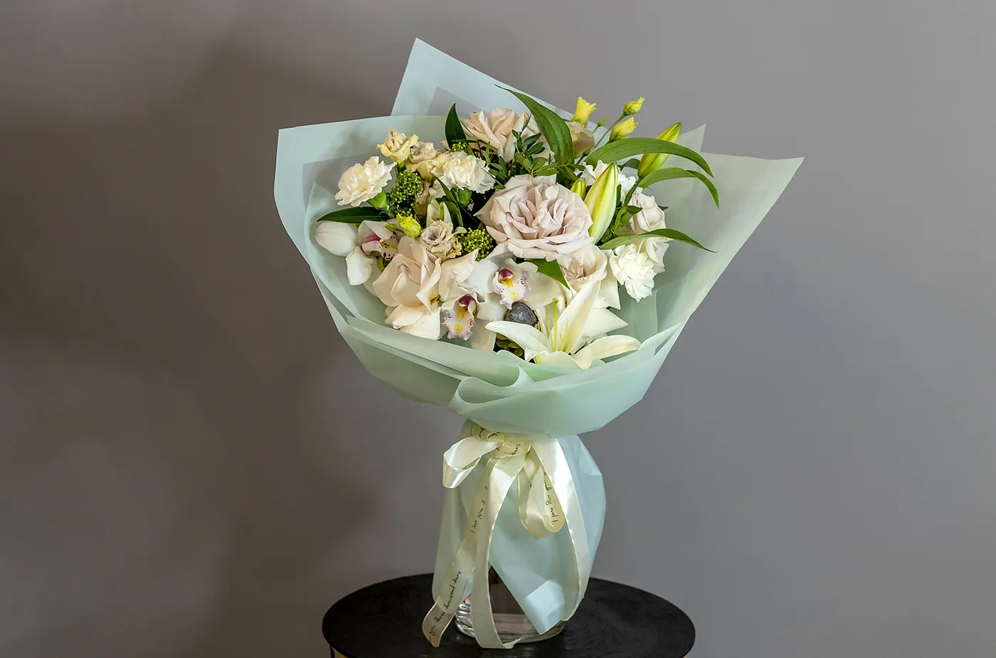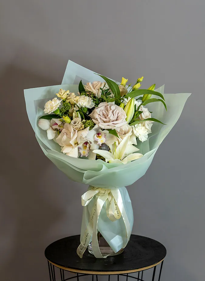 Живые цветы всегда уникальны, поэтому букет может немного отличаться от фото. При отсутствии какого-то сорта мы предложим его замену на другой, близкий по оттенку и равный по стоимости.