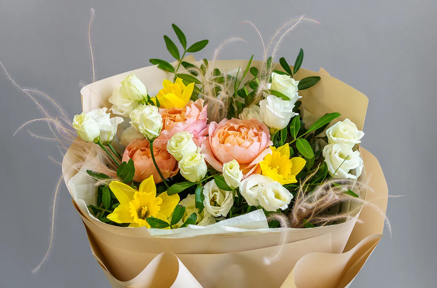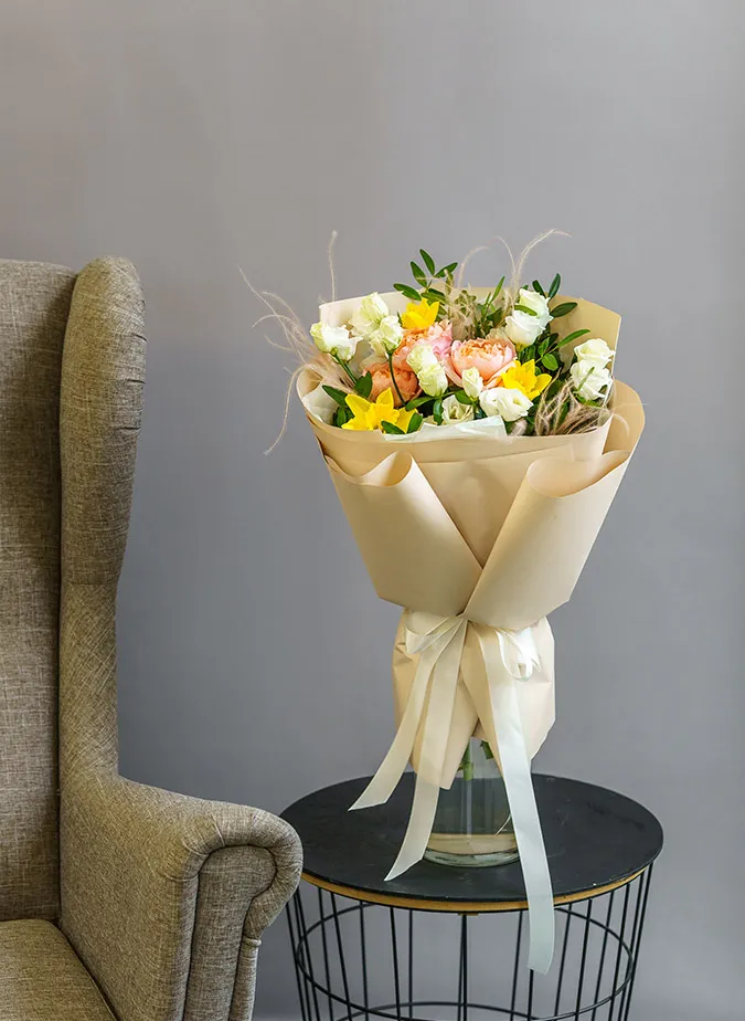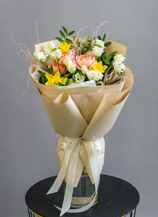 Состав: роза кустовая, нарцисс,эустома, писташ
