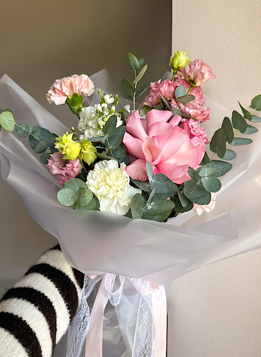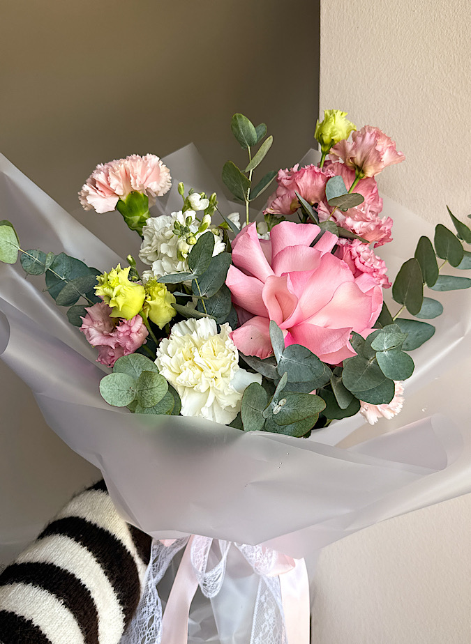 Состав: роза, георгин, эвкалипт, эустома, гвоздика, маттиола