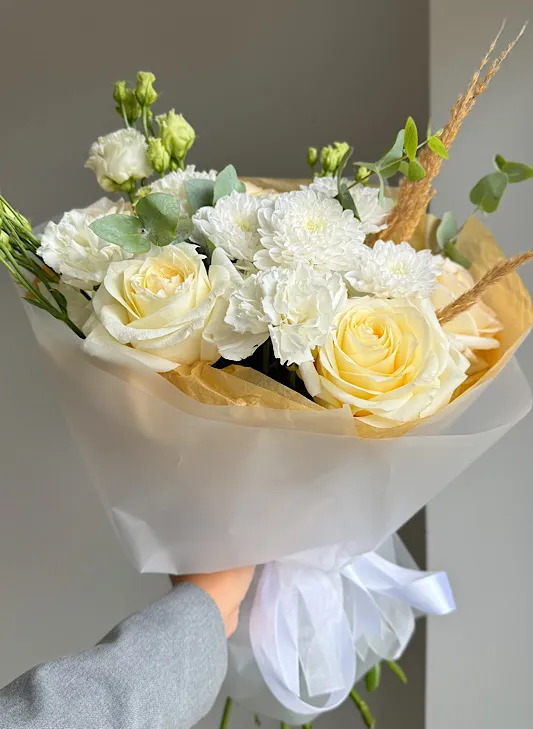 Живые цветы всегда уникальны, поэтому букет может немного отличаться от фото. При отсутствии какого-то сорта мы предложим его замену на другой, близкий по оттенку и равный по стоимости.