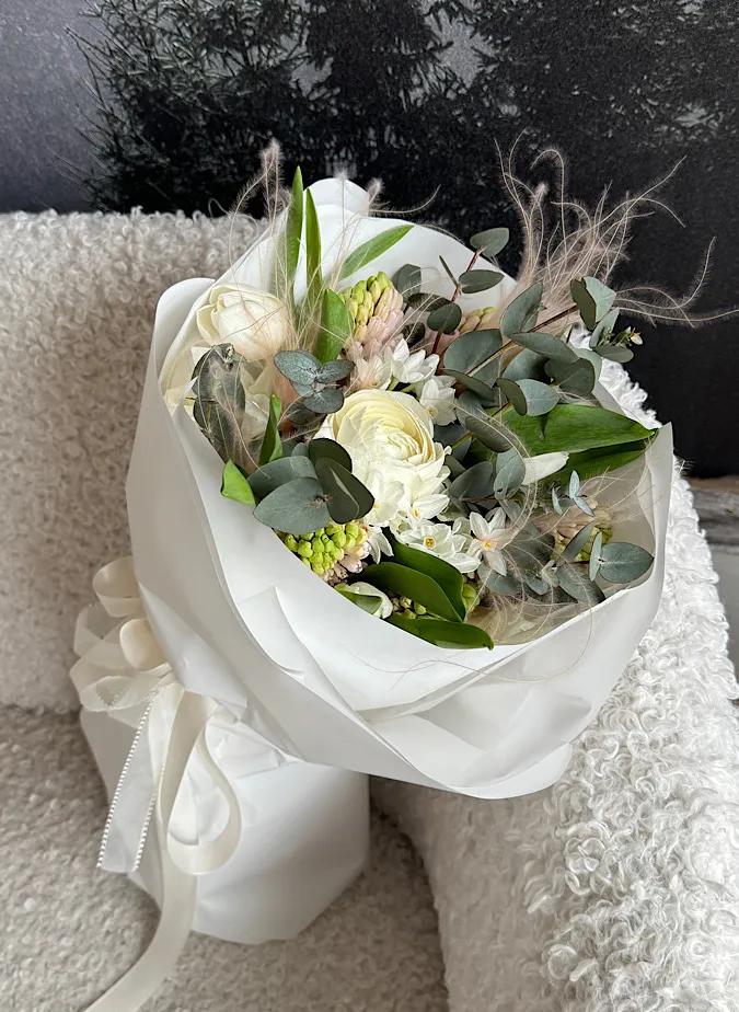 Состав: гиацинт, тюльпан, нарцисс,ранункулюс, эвкалипт