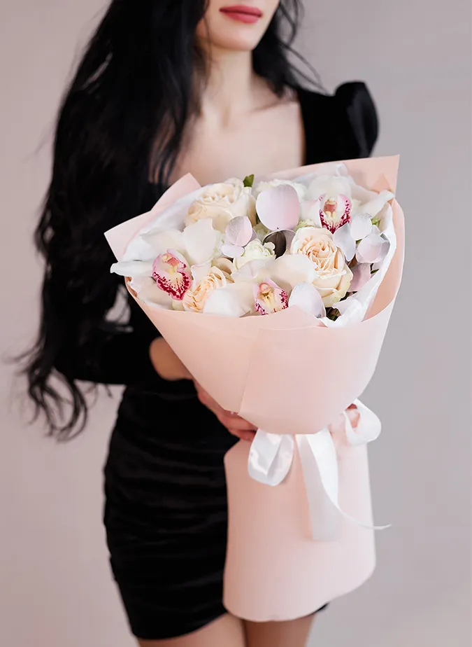 Состав: роза кустовая, эвкалипт, орхидея, роза