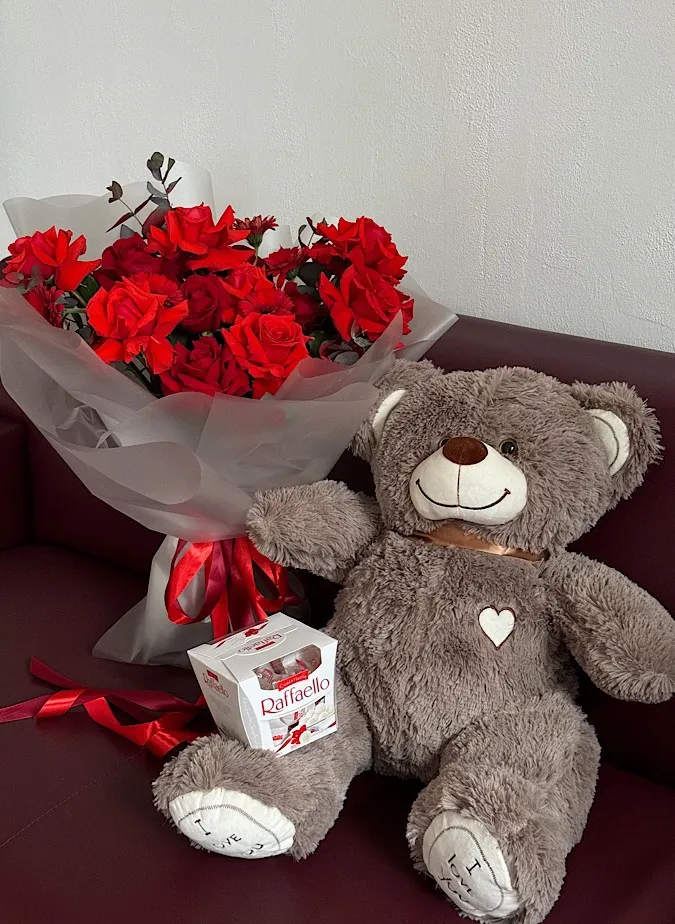 Состав: Букет из красных роз с герберой и эвкалиптом в упаковке, конфеты, мишка