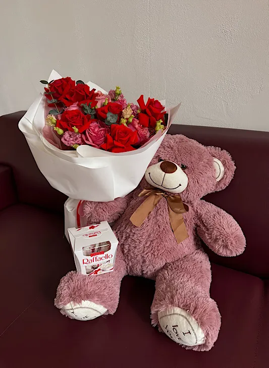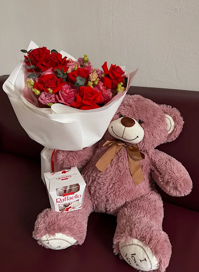 Состав: Букет из красных роз с эустомой и эвкалиптом в упаковке, конфеты, мишка