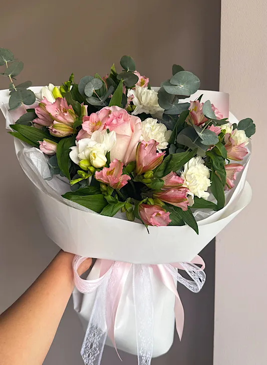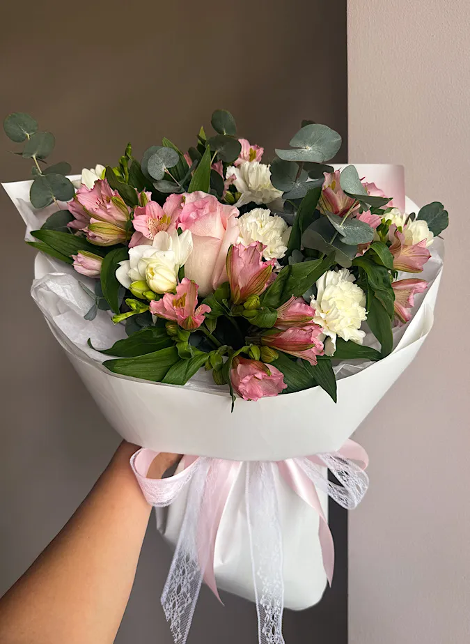 Состав: альстромерия, эвкалипт, гвоздика, роза