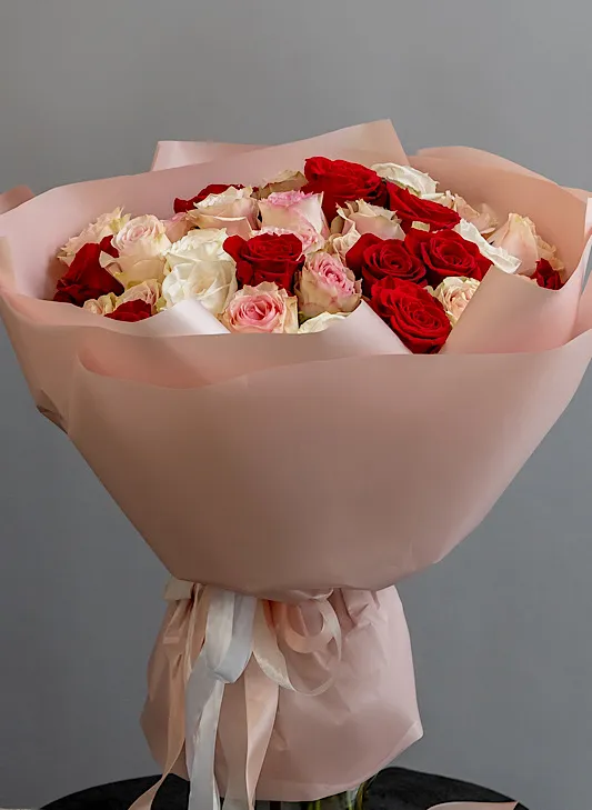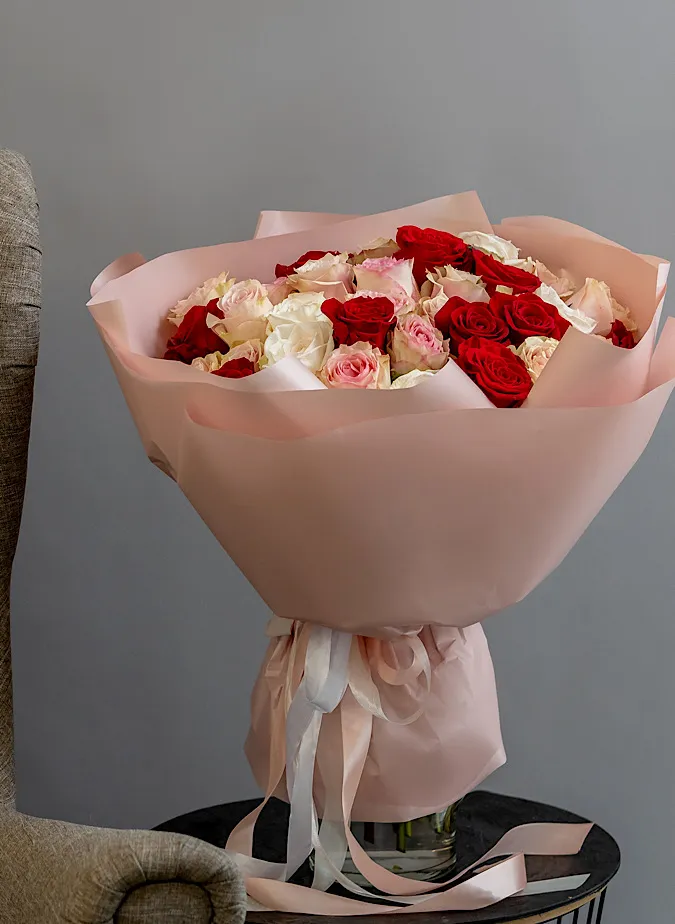 Живые цветы всегда уникальны, поэтому букет может немного отличаться от фото. При отсутствии какого-то сорта мы предложим его замену на другой, близкий по оттенку и равный по стоимости.