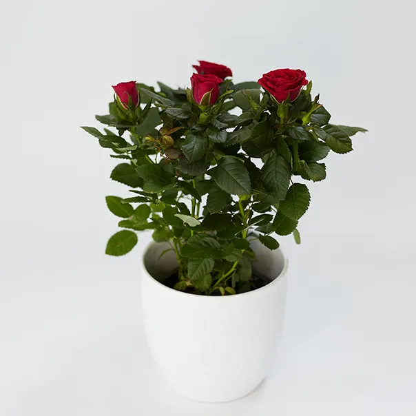 Горшечные розы – это компактные кустики до 35-45 см. Цветки комнатной розы мелкие, очень декоративные, бывают душистые или без запаха, разнообразной окраски. Уход за комнатной розой различается по сезонам года. Как и в естественных условиях, ей требуется холодная зимовка. Слишком высокая температура летом тоже вредна. В теплое время года эти растения рекомендуют выносить на открытый воздух.