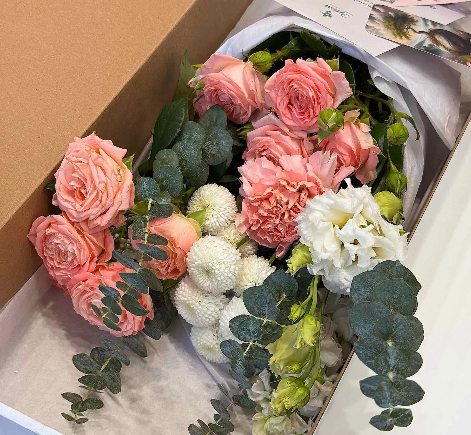 В коробке вы найдёте свежие цветы, аккуратно упакованные для сохранности, кризал и инструкцию по сборке — всё, что нужно, чтобы создать букет в своём ритме. Это не просто флористика, а практика внимательности: почувствуйте текстуры, вдыхайте ароматы, дайте волю интуиции.