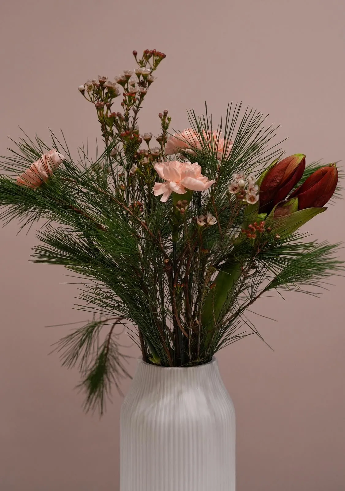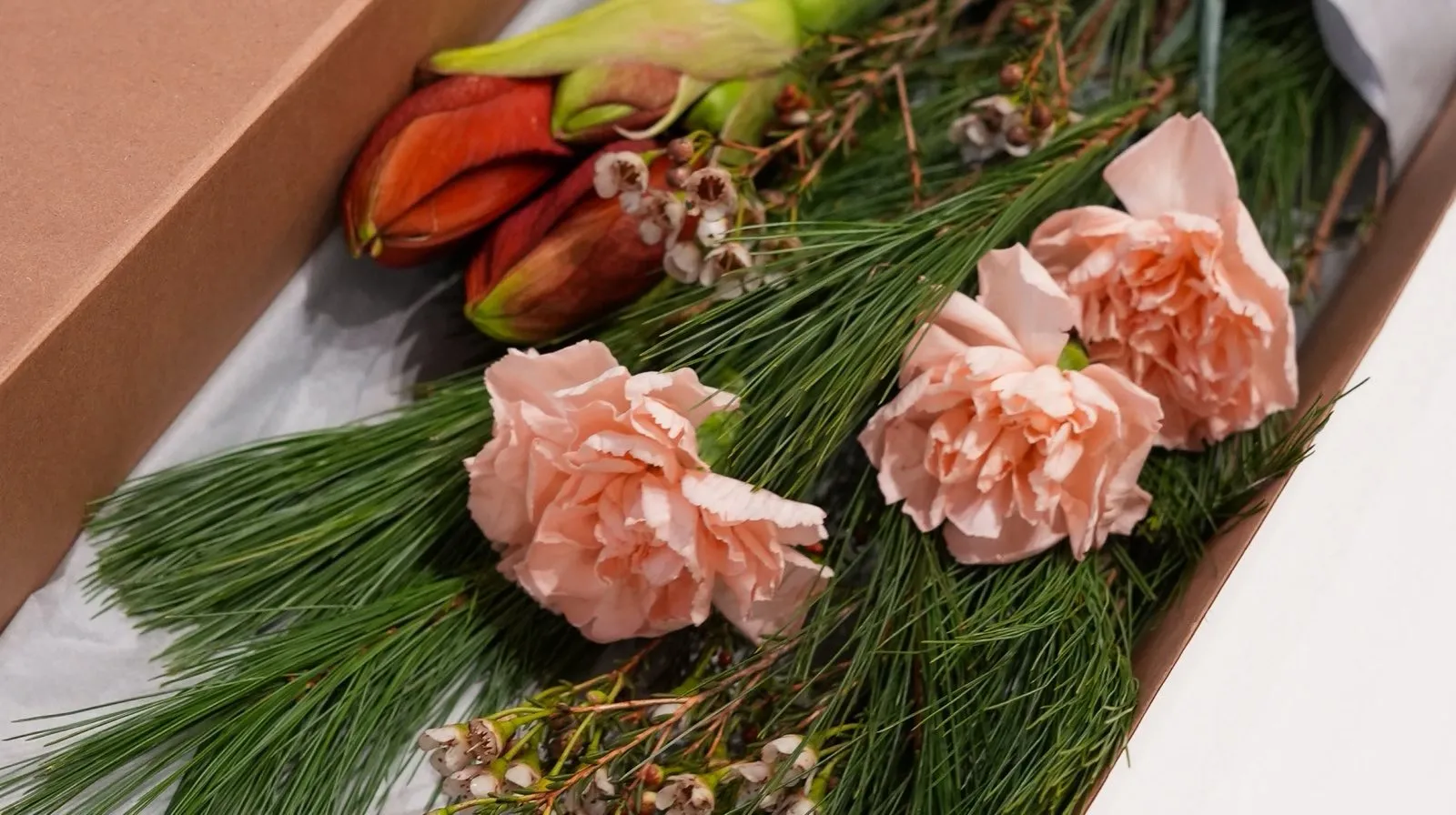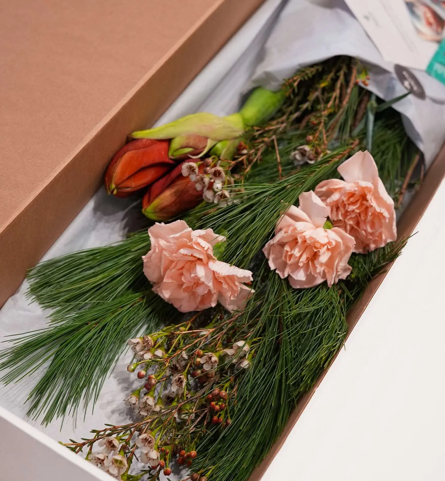 Состав: Гвоздика, нобилис, пинус, хамелациум, амарилис, коробка